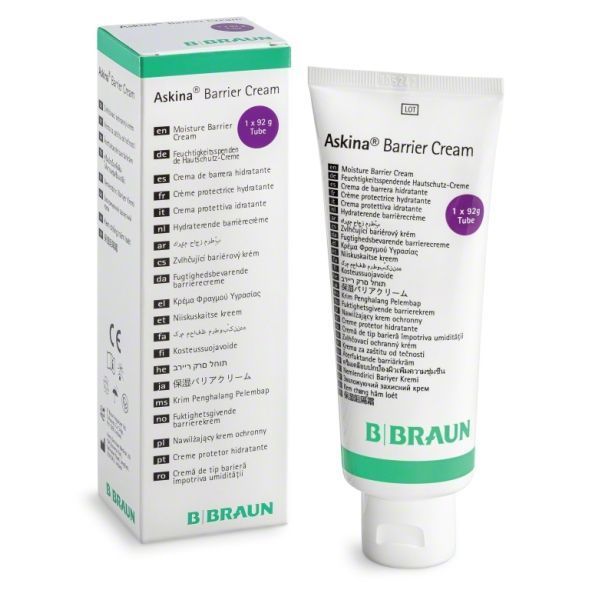 • Askina® Barrier Cream is intended for use as a moisturizing protective barrier for dry and irritated skin.