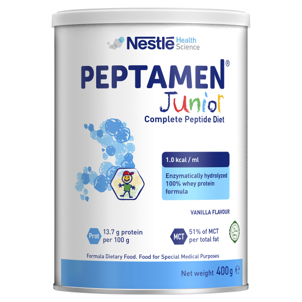 Peptamen® Junior is a food for special medical purposes specially formulated for the dietary management of gastrointestinal impairment in children aged 1-10 years. Must be used under medical supervision.